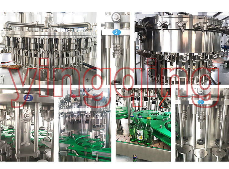 在一機上實現沖瓶、灌裝、封蓋。整機設計科學合理,外形美觀、維修方便,懸掛式卡瓶口輸送瓶結構,更換瓶型更方便,快捷省力。主機采先進的PL可編程自動控制技術,關鍵的電器元件均采用國際知名商家的產品。